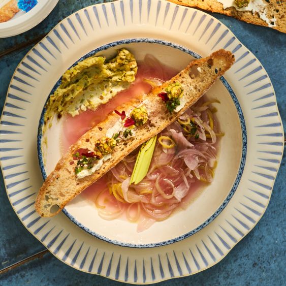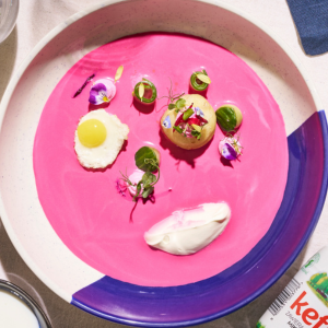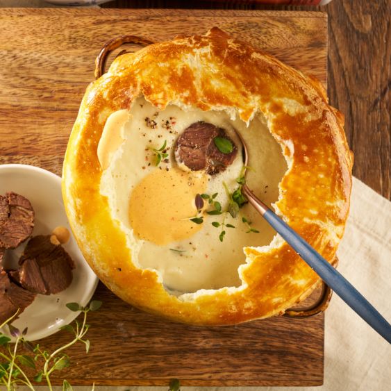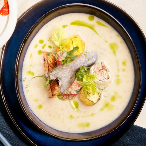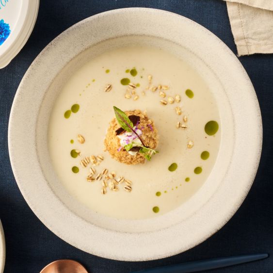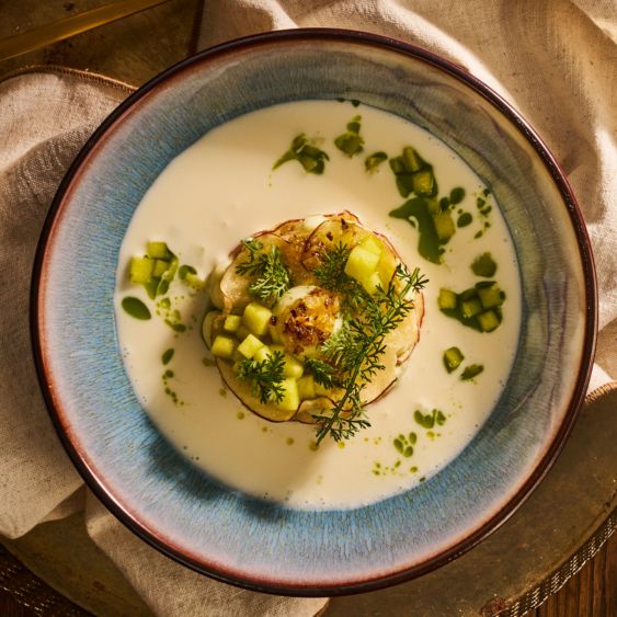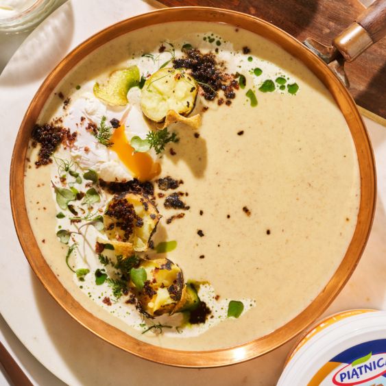 Krem z selera z pianką chorizo zapiekany pod ciastem drożdżowym