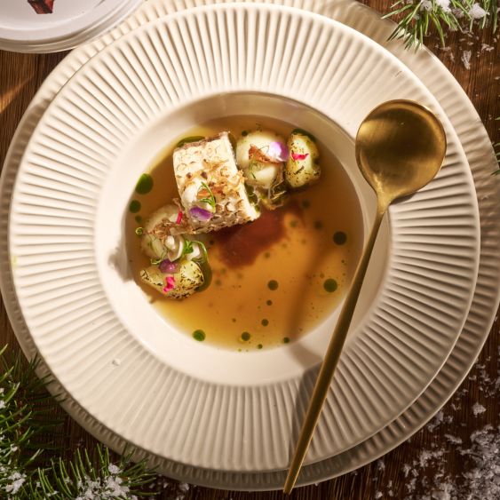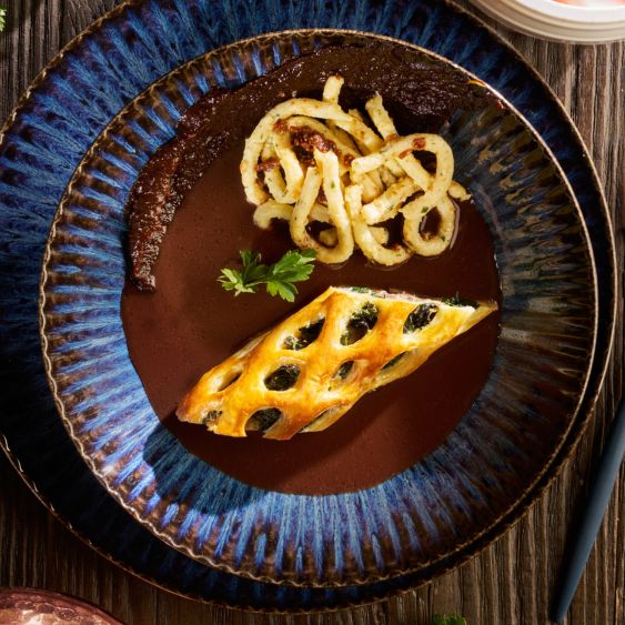 Filet z gęsi confit w asyście warzyw i bliny na kwaśnej śmietanie i sosie korzennym