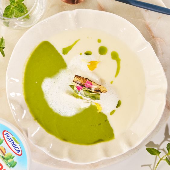Krem z groszku zielonego i brokułu w asyście śmietanki